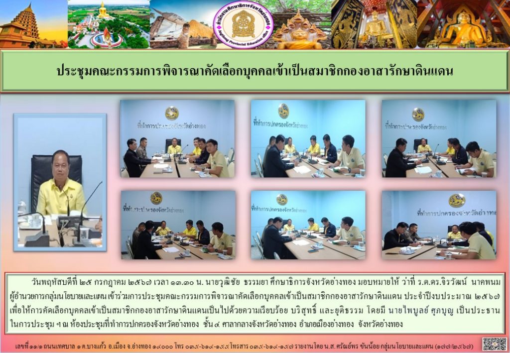 วันพฤหัสบดีที่ 25 กรกฎาคม 2567 เวลา 13.30 น. นายวุฒิชัย ธรรมยา ศึกษาธิการจังหวัดอ่างทอง มอบหมายให้ ว่าที่ ร.ต.ดร.จิรวัฒน์ นาคพนมผู้อำนวยการกลุ่มนโยบายและแผน เข้าร่วมการประชุมคณะกรรมการพิจารณาคัดเลือกบุคคลเข้าเป็นสมาชิกกองอาสารักษาดินแดน ประจำปีงบประมาณ 2567 เพื่อให้การคัดเลือกบุคคลเข้าเป็นสมาชิกกองอาสารักษาดินแดนเป็นไปด้วยความเรียบร้อย บริสุทธิ์ และยุติธรรม โดยมี นายไพบูลย์ ศุภบุญ เป็นประธาน