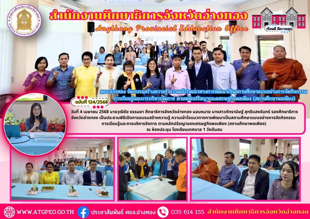 วันที่ 4 เมษายน 2568 นายวุฒิชัย ธรรมยา ศึกษาธิการจังหวัดอ่างทอง มอบหมาย นางสาวภัทรานิษฐ์ สุทธิแสงจันทร์ รองศึกษาธิการ จังหวัดอ่างทอง เป็นประธานพิธีเปิดการอบรมสร้างความรู้ ความเข้าใจแนวทางการพัฒนาเป็นสถานศึกษาแบบอย่างการจัดกิจกรรม การเรียนรู้และการบริหารจัดการ ตามหลักปรัชญาของเศรษฐกิจพอเพียง (สถานศึกษาพอเพียง) ณ ห้องประชุม โรงเรียนเทศบาล 1 วัดต้นสน