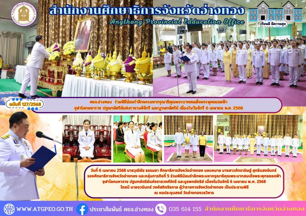 วันที่ 6 เมษายน 2568 นายวุฒิชัย ธรรมยา ศึกษาธิการจังหวัดอ่างทอง มอบหมาย นางสาวภัทรานิษฐ์ สุทธิแสงจันทร์ รองศึกษาธิการจังหวัดอ่างทอง และกลุ่มภารกิจที่ 5 ร่วมพิธีน้อมรำลึกพระมหากรุณาธิคุณพระบาทสมเด็จพระพุทธยอดฟ้าจุฬาโลกมหาราช ปฐมกษัตริย์แห่งราชวงศ์จักรี และบูรพกษัตริย์ เนื่องในวันจักรี 6 เมษายน พ.ศ. 2568 โดยมี นายชวนินทร์ วงศ์สถิตจิรกาล ผู้ว่าราชการจังหวัดอ่างทอง เป็นประธานในงานรัฐพิธีฯ ณ หอประชุมสงฆ์ วัดอ่างทองวรวิหาร