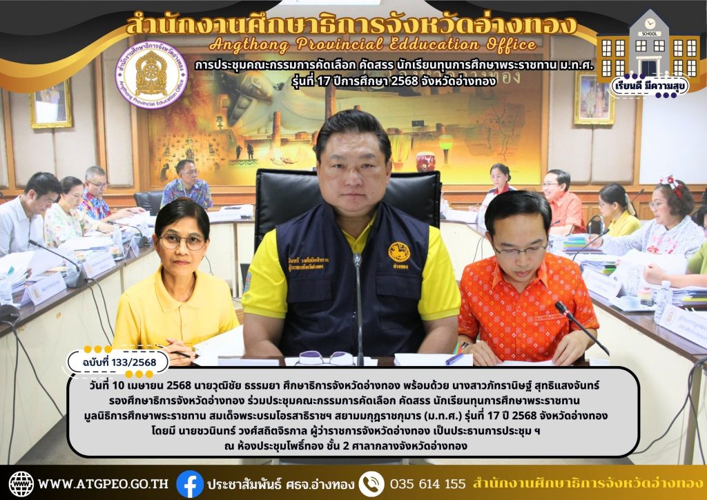 วันที่ 10 เมษายน 2568 นายวุฒิชัย ธรรมยา ศึกษาธิการจังหวัดอ่างทอง พร้อมด้วย นางสาวภัทรานิษฐ์ สุทธิแสงจันทร์ รองศึกษาธิการจังหวัดอ่างทอง ร่วมประชุมคณะกรรมการคัดเลือก คัดสรร นักเรียนทุนการศึกษาพระราชทาน มูลนิธิการศึกษาพระราชทาน สมเด็จพระบรมโอรสาธิราชฯ สยามมกุฎราชกุมาร (ม.ท.ศ.) รุ่นที่ 17 ปี 2568 จังหวัดอ่างทอง โดยมี นายชวนินทร์ วงศ์สถิตจิรกาล ผู้ว่าราชการจังหวัดอ่างทอง เป็นประธานการประชุม ฯ ณ ห้องประชุมโพธิ์ทอง ชั้น 2 ศาลากลางจังหวัดอ่างทอง