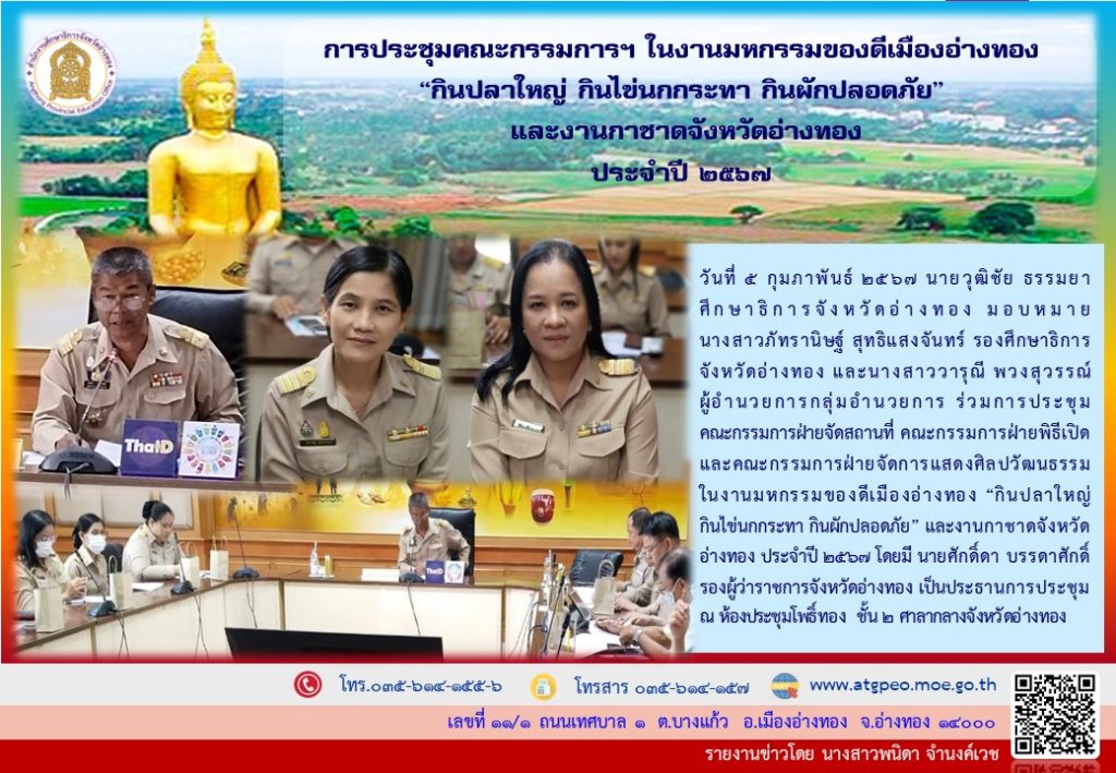 วันที่ 5 กุมภาพันธ์ 2567 นายวุฒิชัย ธรรมยา ศึกษาธิการจังหวัดอ่างทอง มอบหมาย นางสาวภัทรานิษฐ์ สุทธิแสงจันทร์ รองศึกษาธิการ จังหวัดอ่างทอง และนางสาววารุณี พวงสุวรรณ์ ผู้อำนวยการกลุ่มอำนวยการ ร่วมการประชุมคณะกรรมการฝ่ายจัดสถานที่ คณะกรรมการฝ่ายพิธีเปิด และคณะกรรมการฝ่ายจัดการแสดงศิลปวัฒนธรรม ในงานมหกรรมของดีเมืองอ่างทอง “กินปลาใหญ่ กินไข่นกกระทา กินผักปลอดภัย” และงานกาชาดจังหวัดอ่างทอง ประจำปี 2567 โดยมี นายศักดิ์ดา บรรดาศักดิ์ รองผู้ว่าราชการจังหวัดอ่างทอง เป็นประธานการประชุม ณ ห้องประชุมโพธิ์ทอง ชั้น 2 ศาลากลางจังหวัดอ่างทอง