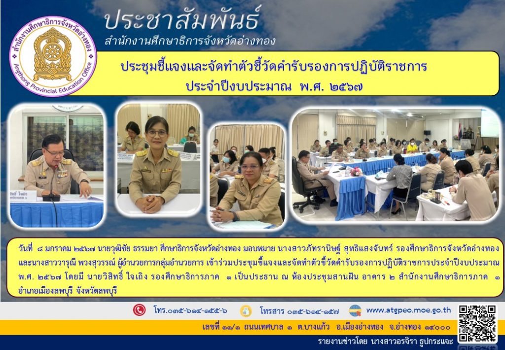 วันที่  8 มกราคม 2567 นายวุฒิชัย ธรรมยา ศึกษาธิการจังหวัดอ่างทอง มอบหมาย นางสาวภัทรานิษฐ์ สุทธิแสงจันทร์ รองศึกษาธิการจังหวัดอ่างทอง และนางสาววารุณี พวงสุวรรณ์ ผู้อำนวยการกลุ่มอำนวยการ เข้าร่วมประชุมชี้แจงและจัดทำตัวชี้วัดคำรับรองการปฏิบัติราชการประจำปีงบประมาณ พ.ศ. 2567 โดยมี นายวิสิทธิ์ ใจเถิง รองศึกษาธิการภาค  1 เป็นประธาน ณ ห้องประชุมสานฝัน อาคาร 2 สำนักงานศึกษาธิการภาค  1 อำเภอเมืองลพบุรี จังหวัดลพบุรี