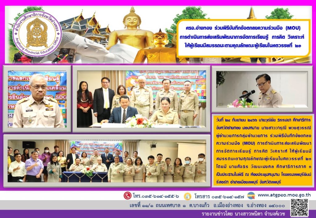 วันที่ ๒๕ กันยายน ๒๕๖๖ นายวุฒิชัย ธรรมยา ศึกษาธิการจังหวัดอ่างทอง มอบหมาย นางสาววารุณี พวงสุวรรณ์ ผู้อำนวยการกลุ่มอำนวยการ ร่วมพิธีบันทึกข้อตกลง ความร่วมมือ (MOU) การดำเนินการส่งเสริมพัฒนาการจัดการเรียนรู้ การคิด วิเคราะห์ ให้ผู้เรียนมี สมรรถนะตามคุณลักษณะผู้เรียนในศตวรรษที่ ๒๑ โดยมี นายศัจธร วัฒนะมงคล ศึกษาธิการภาค ๑ เป็นประธานในพิธี ณ ห้องประชุมหนุมาน โรงแรมลพบุรีอินน์ รีสอร์ท อำเภอเมืองลพบุรี จังหวัดลพบุรี