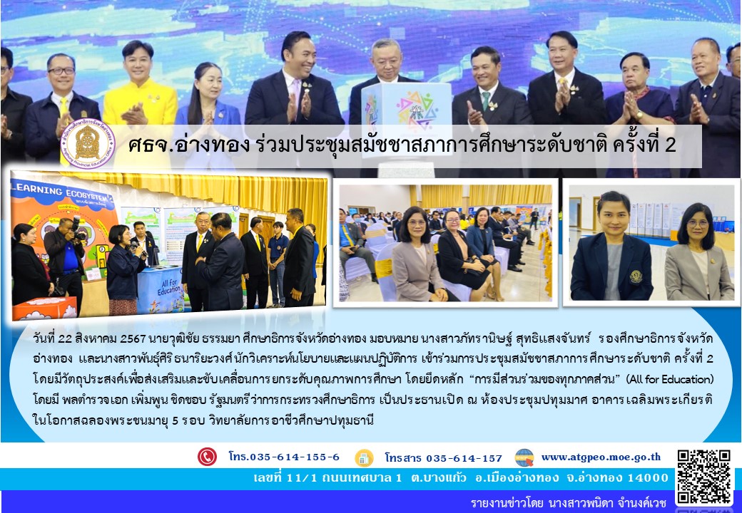 วันที่ 22 สิงหาคม 2567 นายวุฒิชัย ธรรมยา ศึกษาธิการจังหวัดอ่างทอง มอบหมาย นางสาวภัทรานิษฐ์ สุทธิแสงจันทร์ รองศึกษาธิการจังหวัดอ่างทอง และนางสาวพันธุ์ศิริ ธนาริยะวงศ์ นักวิเคราะห์นโยบายและแผนปฏิบัติการ เข้าร่วมการประชุมสมัชชาสภาการศึกษาระดับชาติ ครั้งที่ 2 โดยมีวัตถุประสงค์เพื่อส่งเสริมและขับเคลื่อนการยกระดับคุณภาพการศึกษา โดยยึดหลัก “การมีส่วนร่วมของทุกภาคส่วน” (All for Education) โดยมี พลตำรวจเอก เพิ่มพูน ชิดชอบ รัฐมนตรีว่าการกระทรวงศึกษาธิการ เป็นประธานเปิด ณ ห้องประชุมปทุมมาศ อาคารเฉลิมพระเกียรติในโอกาสฉลองพระชนมายุ 5 รอบ วิทยาลัยการอาชีวศึกษาปทุมธานี