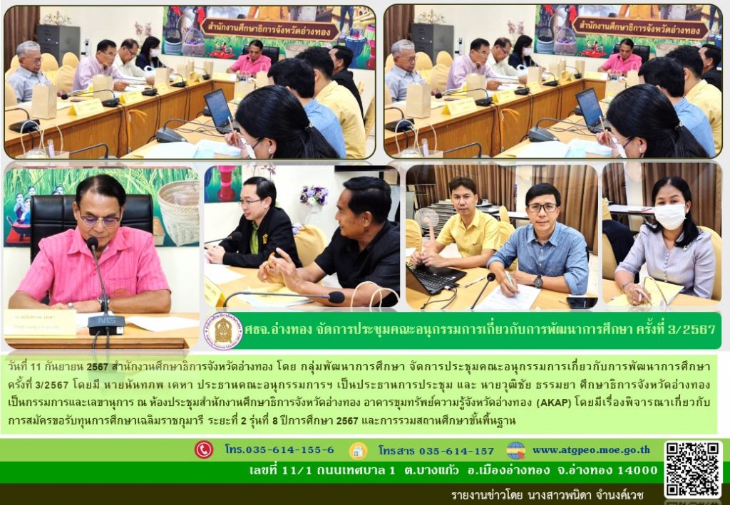 วันที่ 11 กันยายน 2567 สำนักงานศึกษาธิการจังหวัดอ่างทอง โดย กลุ่มพัฒนาการศึกษา จัดการประชุมคณะอนุกรรมการเกี่ยวกับการพัฒนาการศึกษา ครั้งที่ 3/2567 โดยมี นายนันทภพ เคหา ประธานคณะอนุกรรมการฯ เป็นประธานการประชุม และ นายวุฒิชัย ธรรมยา ศึกษาธิการจังหวัดอ่างทอง เป็นกรรมการและเลขานุการ ณ ห้องประชุมสำนักงานศึกษาธิการจังหวัดอ่างทอง อาคารขุมทรัพย์ความรู้จังหวัดอ่างทอง (AKAP) โดยมีเรื่องพิจารณาเกี่ยวกับการสมัครขอรับทุนการศึกษาเฉลิมราชกุมารี ระยะที่ 2 รุ่นที่ 8 ปีการศึกษา 2567 และการรวมสถานศึกษาขั้นพื้นฐาน