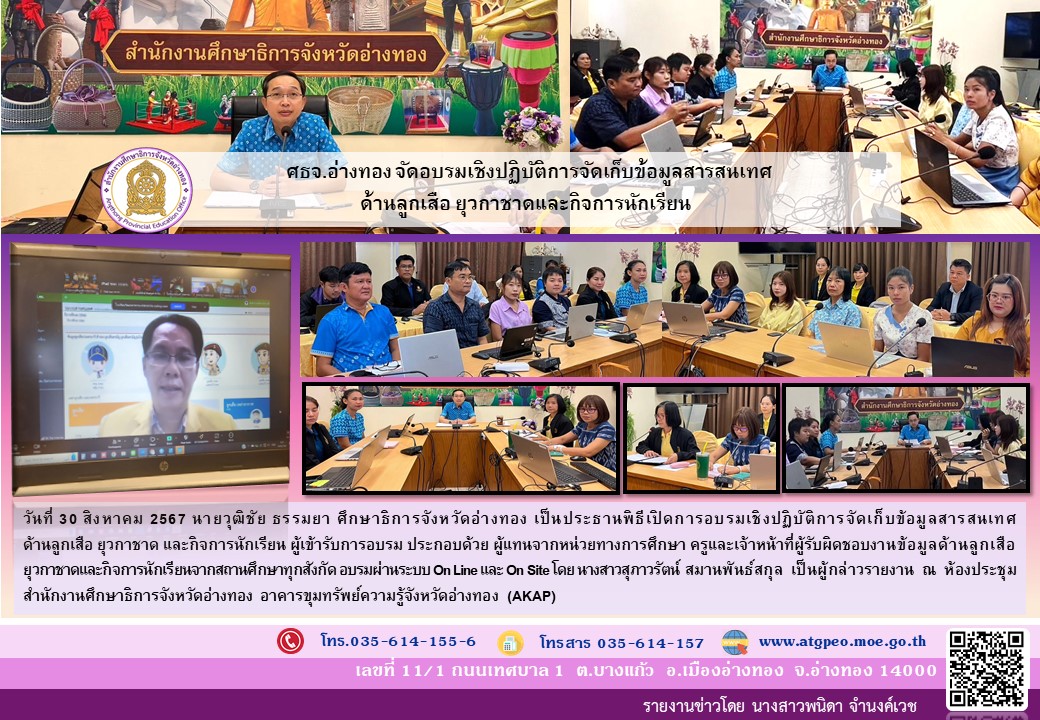 วันที่ 30 สิงหาคม 2567 นายวุฒิชัย ธรรมยา ศึกษาธิการจังหวัดอ่างทอง เป็นประธานพิธีเปิดการอบรมเชิงปฏิบัติการจัดเก็บข้อมูลสารสนเทศ ด้านลูกเสือ ยุวกาชาด และกิจการนักเรียน ผู้เข้ารับการอบรม ประกอบด้วย ผู้แทนจากหน่วยทางการศึกษา ครูและเจ้าหน้าที่ผู้รับผิดชอบงานข้อมูลด้านลูกเสือ ยุวกาชาดและกิจการนักเรียนจากสถานศึกษาทุกสังกัด อบรมผ่านระบบ On Line และ On Site โดย นางสาวสุภาวรัตน์ สมานพันธ์สกุล เป็นผู้กล่าวรายงาน ณ ห้องประชุมสำนักงานศึกษาธิการจังหวัดอ่างทอง อาคารขุมทรัพย์ความรู้จังหวัดอ่างทอง (AKAP)