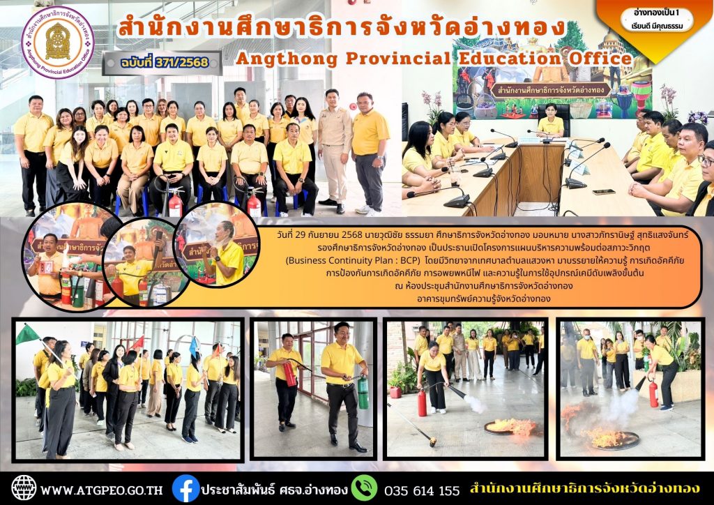 วันที่ 29 กันยายน 2568 นายวุฒิชัย ธรรมยา ศึกษาธิการจังหวัดอ่างทอง มอบหมาย นางสาวภัทรานิษฐ์ สุทธิแสงจันทร์ รองศึกษาธิการจังหวัดอ่างทอง เป็นประธานเปิดกิจกรรมโครงการแผนบริหารความพร้อมต่อสภาวะวิกฤต (Business Continuity Plan : BCP) โดยมีวิทยาจากเทศบาลตำบลแสวงหา มาบรรยายให้ความรู้ การเกิดอัคคีภัย การป้องกันการเกิดอัคคีภัย การอพยพหนีไฟ และความรู้ในการใช้อุปกรณ์เคมีดับเพลิงขั้นต้น ณ ห้องประชุมสำนักงานศึกษาธิการจังหวัดอ่างทอง อาคารขุมทรัพย์ความรู้จังหวัดอ่างทอง