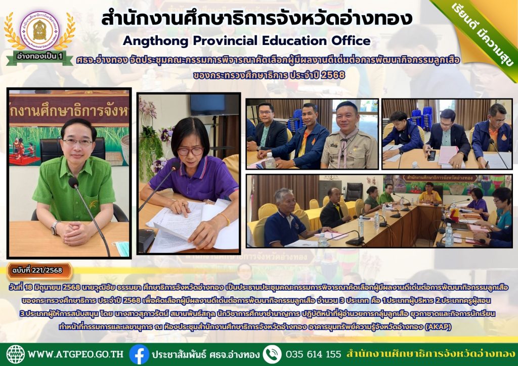 วันที่ 18 มิถุนายน 2568 นายวุฒิชัย ธรรมยา ศึกษาธิการจังหวัดอ่างทอง เป็นประธานประชุมคณะกรรมการพิจารณาคัดเลือกผู้มีผลงานดีเด่นต่อการพัฒนากิจกรรมลูกเสือ ของกระทรวงศึกษาธิการ ประจำปี 2568 เพื่อคัดเลือกผู้มีผลงานดีเด่นต่อการพัฒนากิจกรรมลูกเสือ จำนวน 3 ประเภท คือ 1.ประเภทผู้บริหาร 2.ประเภทครูผู้สอน 3.ประเภทผู้ให้การสนับสนุน โดย นางสาวสุภาวรัตน์ สมานพันธ์สกุล นักวิชาการศึกษาชำนาญการ ปฏิบัติหน้าที่ผู้อำนวยการกลุ่มลูกเสือ ยุวกาชาดและกิจการนักเรียน ทำหน้าที่กรรมการและเลขานุการ ณ ห้องประชุมสำนักงานศึกษาธิการจังหวัดอ่างทอง อาคารขุมทรัพย์ความรู้จังหวัดอ่างทอง (AKAP)