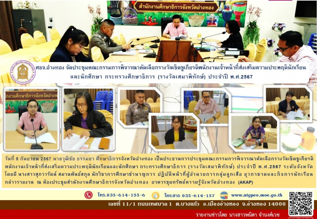 วันที่ 5 กันยายน 2567 นายวุฒิชัย ธรรมยา ศึกษาธิการจังหวัดอ่างทอง เป็นประธานการประชุมคณะกรรมการพิจารณาคัดเลือกรางวัลเชิดชูเกียรติ พนักงานเจ้าหน้าที่ส่งเสริมความประพฤตินักเรียนและนักศึกษา กระทรวงศึกษาธิการ (รางวัลเสมาพิทักษ์) ประจำปี พ.ศ.2567 ระดับจังหวัด โดยมี นางสาวสุภาวรัตน์ สมานพันธ์สกุล นักวิชาการศึกษาชำนาญการ ปฏิบัติหน้าที่ผู้อำนวยการกลุ่มลูกเสือ ยุวกาชาดและกิจการนักเรียน กล่าวรายงาน ณ ห้องประชุมสำนักงานศึกษาธิการจังหวัดอ่างทอง อาคารขุมทรัพย์ความรู้จังหวัดอ่างทอง (AKAP)
