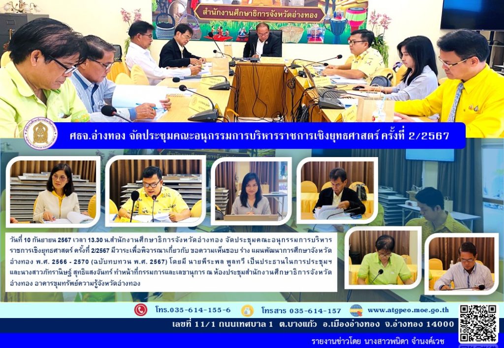 วันที่ 10 กันยายน 2567 เวลา 13.30 น.สำนักงานศึกษาธิการจังหวัดอ่างทอง จัดประชุมคณะอนุกรรมการบริหารราชการเชิงยุทธศาสตร์ ครั้งที่ 2/2567 มีวาระเพื่อพิจารณาเกี่ยวกับ ขอความเห็นชอบ ร่าง แผนพัฒนาการศึกษาจังหวัดอ่างทอง พ.ศ. 2566 – 2570 (ฉบับทบทวน พ.ศ. 2567) โดยมี นายพีระพล พูลทวี เป็นประธานในการประชุมฯ และนางสาวภัทรานิษฐ์ สุทธิแสงจันทร์ ทำหน้าที่อนุกรรมการและผู้ช่วยเลขานุการ ณ ห้องประชุมสำนักงานศึกษาธิการจังหวัดอ่างทอง อาคารขุมทรัพย์ความรู้จังหวัดอ่างทอง