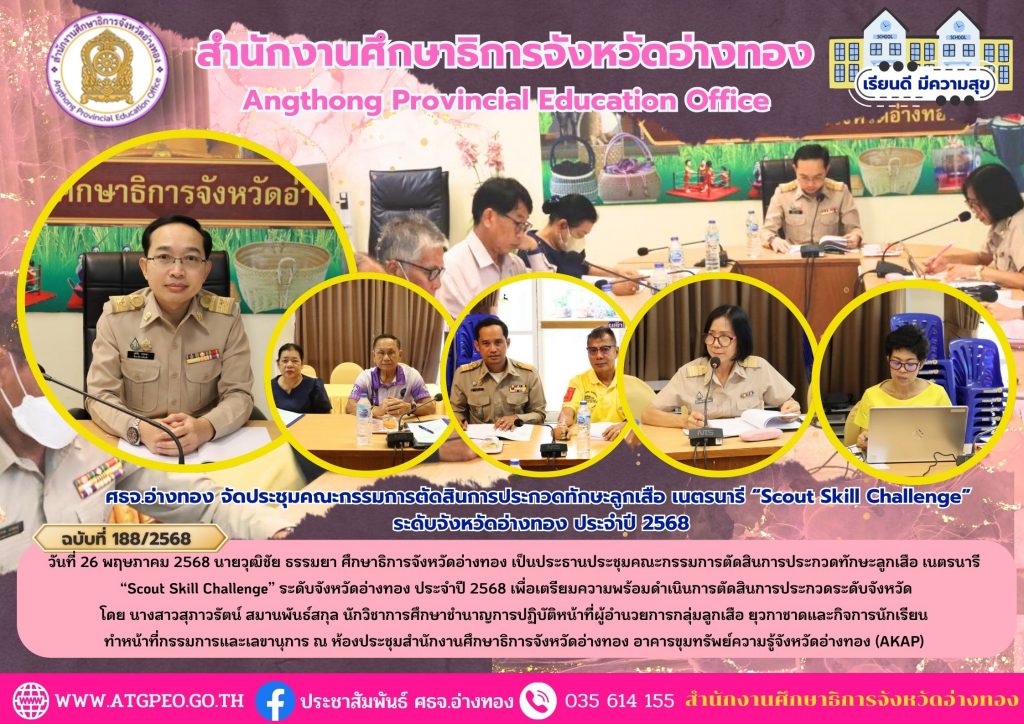 วันที่ 26 พฤษภาคม 2568 นายวุฒิชัย ธรรมยา ศึกษาธิการจังหวัดอ่างทอง เป็นประธานประชุมคณะกรรมการตัดสินการประกวดทักษะลูกเสือ เนตรนารี “Scout Skill Challenge” ระดับจังหวัดอ่างทอง ประจำปี 2568 เพื่อเตรียมความพร้อมดำเนินการตัดสินการประกวดระดับจังหวัด โดย นางสาวสุภาวรัตน์ สมานพันธ์สกุล นักวิชาการศึกษาชำนาญการปฏิบัติหน้าที่ผู้อำนวยการกลุ่มลูกเสือ ยุวกาชาดและกิจการนักเรียน ทำหน้าที่กรรมการและเลขานุการ ณ ห้องประชุมสำนักงานศึกษาธิการจังหวัดอ่างทอง อาคารขุมทรัพย์ความรู้จังหวัดอ่างทอง (AKAP)