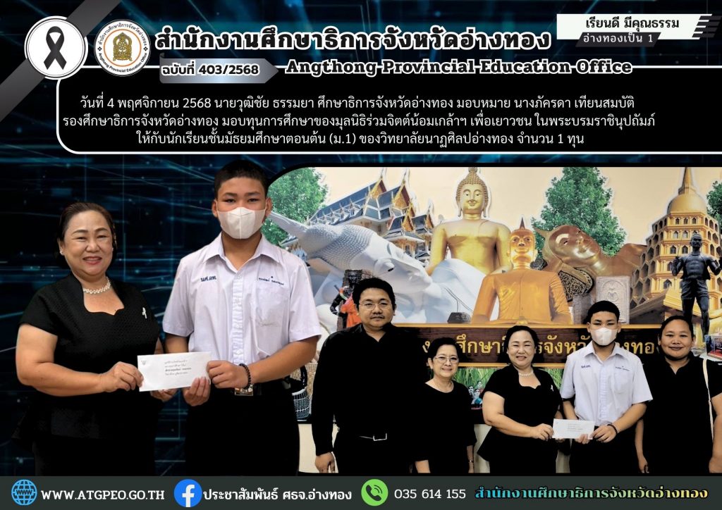 วันที่ 4 พฤศจิกายน 2568 นายวุฒิชัย ธรรมยา ศึกษาธิการจังหวัดอ่างทอง มอบหมายให้ นางภัครดา เทียนสมบัติ รองศึกษาธิการจังหวัดอ่างทอง มอบทุนการศึกษาของมุลนิธิร่วมจิตต์น้อมเกล้าฯ เพื่อเยาวชน ในพระบรมราชินุปถัมภ์ ให้กับนักเรียนชั้นมัธยมศึกษาตอนต้น (ม.1) ของวิทยาลัยนาฏศิลปอ่างทอง จำนวน 1 ทุน