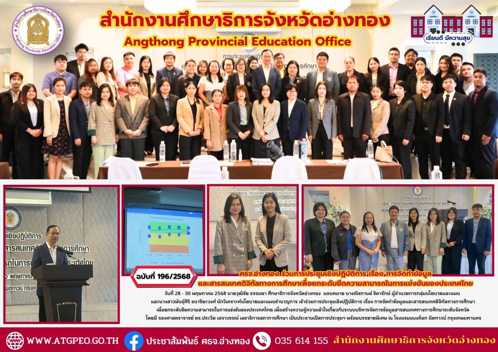 วันที่ 28 – 30 พฤษภาคม 2568 นายวุฒิชัย ธรรมยา ศึกษาธิการจังหวัดอ่างทอง มอบหมาย นางณิชกานต์ ชิตารักษ์ ผู้อำนวยการกลุ่มนโยบายและแผน และนางสาวพันธุ์ศิริ ธนาริยะวงศ์ นักวิเคราะห์นโยบายและแผนชำนาญการ เข้าร่วมการประชุมเชิงปฏิบัติการ เรื่อง การจัดทำข้อมูลและสารสนเทศดิจิทัลทางการศึกษาเพื่อยกระดับขีดความสามารถในการแข่งขันของประเทศไทย เพื่อสร้างความรู้ความเข้าใจเกี่ยวกับระบบบริหารจัดการข้อมูลสารสนเทศทางการศึกษาระดับจังหวัดโดยมี รองศาสตราจารย์ ดร.ประวิต เอราวรรณ์ เลขาธิการสภาการศึกษา เป็นประธานเปิดการประชุมฯ พร้อมบรรยายพิเศษ ณ โรงแรมแบงค็อก มิดทาวน์ กรุงเทพมหานคร