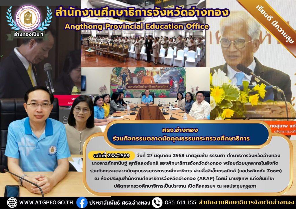 วันที่ 27 มิถุนายน 2568 นายวุฒิชัย ธรรมยา ศึกษาธิการจังหวัดอ่างทอง นางสาวภัทรานิษฐ์ สุทธิแสงจันทร์ รองศึกษาธิการจังหวัดอ่างทอง พร้อมด้วยบุคลากรในสังกัด ร่วมกิจกรรมตลาดนัดคุณธรรมกระทรวงศึกษาธิการ ผ่านสื่ออิเล็กทรอนิกส์ (แอปพลิเคชัน Zoom) ณ ห้องประชุมสำนักงานศึกษาธิการจังหวัดอ่างทอง (AKAP) โดยมี นายสุเทพ แก่งสันเทียะ ปลัดกระทรวงศึกษาธิการเป็นประธาน เปิดกิจกรรมฯ ณ หอประชุมคุรุสภา