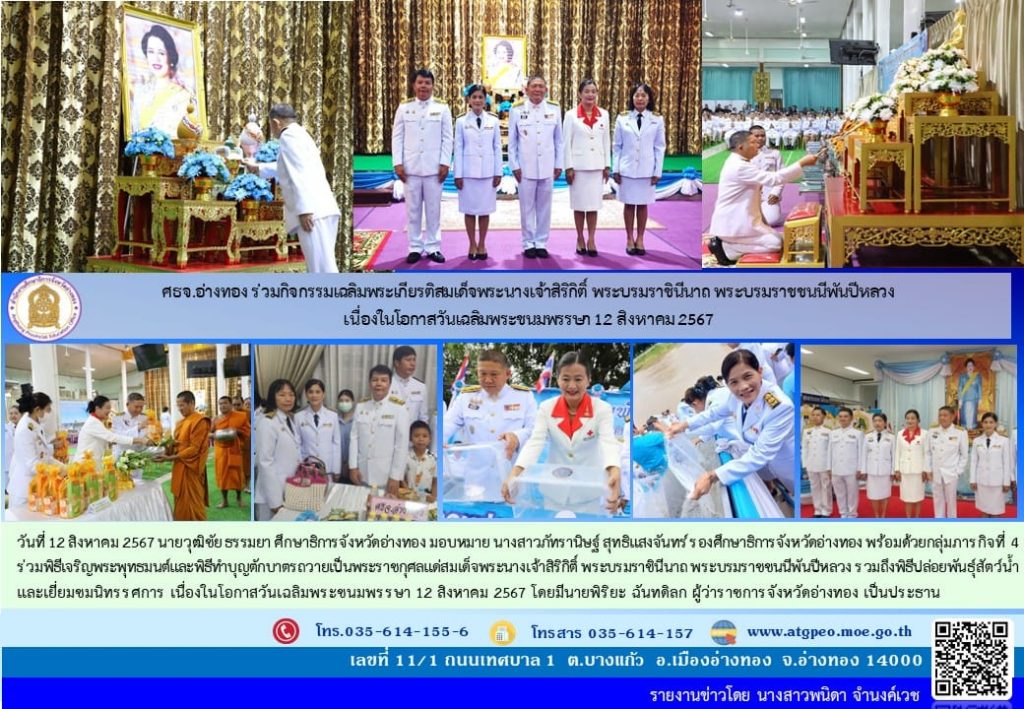 วันที่ 12 สิงหาคม 2567 นายวุฒิชัย ธรรมยา ศึกษาธิการจังหวัดอ่างทอง มอบหมาย นางสาวภัทรานิษฐ์ สุทธิแสงจันทร์ รองศึกษาธิการจังหวัดอ่างทอง พร้อมด้วยกลุ่มภารกิจที่ 4 ร่วมพิธีเจริญพระพุทธมนต์และพิธีทำบุญตักบาตรถวายเป็นพระราชกุศลแด่สมเด็จพระนางเจ้าสิริกิติ์ พระบรมราชินีนาถ พระบรมราชชนนีพันปีหลวง รวมถึงพิธีปล่อยพันธุ์สัตว์น้ำ และเยี่ยมชมนิทรรศการ เนื่องในโอกาสวันเฉลิมพระชนมพรรษา 12 สิงหาคม 2567 โดยมีนายพิริยะ ฉันทดิลก ผู้ว่าราชการจังหวัดอ่างทอง เป็นประธาน