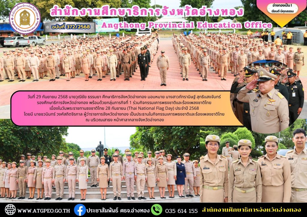 วันที่ 29 กันยายน 2568 นายวุฒิชัย ธรรมยา ศึกษาธิการจังหวัดอ่างทอง มอบหมาย นางสาวภัทรานิษฐ์ สุทธิแสงจันทร์ รองศึกษาธิการจังหวัดอ่างทอง พร้อมด้วยกลุ่มภารกิจที่ 1 ร่วมกิจกรรมเคารพธงชาติและร้องเพลงชาติไทย เนื่องในวันพระราชทานธงชาติไทย 28 กันยายน (Thai National Flag Day) ประจำปี 2568 โดยมี นายชวนินทร์ วงศ์สถิตจิรกาล ผู้ว่าราชการจังหวัดอ่างทอง เป็นประธานในกิจกรรมเคารพธงชาติและร้องเพลงชาติไทย