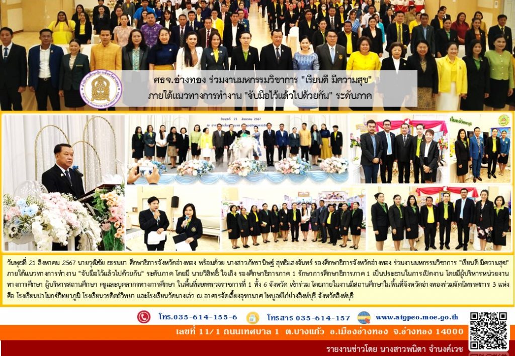 วันพุธที่ 21 สิงหาคม 2567 นายวุฒิชัย ธรรมยา ศึกษาธิการจังหวัดอ่างทอง พร้อมด้วย นางสาวภัทรานิษฐ์ สุทธิแสงจันทร์ รองศึกษาธิการจังหวัดอ่างทอง ร่วมงานมหกรรมวิชาการ “เรียนดี มีความสุข” ภายใต้แนวทางการทำงาน “จับมือไว้แล้วไปด้วยกัน” ระดับภาค โดยมี นายวิสิทธิ์ ใจเถิง รองศึกษาธิการภาค 1 รักษาการศึกษาธิการภาค 1 เป็นประธานในการเปิดงาน โดยมีผู้บริหารหน่วยงาน ทางการศึกษา ผู้บริหารสถานศึกษา ครูและบุคลากรทางการศึกษา ในพื้นที่เขตตรวจราชการที่ 1 ทั้ง 6 จังหวัด เข้าร่วม โดยภายในงานมีสถานศึกษาในพื้นที่จังหวัดอ่างทองร่วมจัดนิทรรศการ 3 แห่ง คือ โรงเรียนปาโมกข์วิทยาภูมิ โรงเรียนวรดิตถ์วิทยา และโรงเรียนวัดนางเล่ว ณ อาคารจัดเลี้ยงจุฑามาศ ไพบูลย์ไก่ย่างสิงห์บุรี จังหวัดสิงห์บุรี