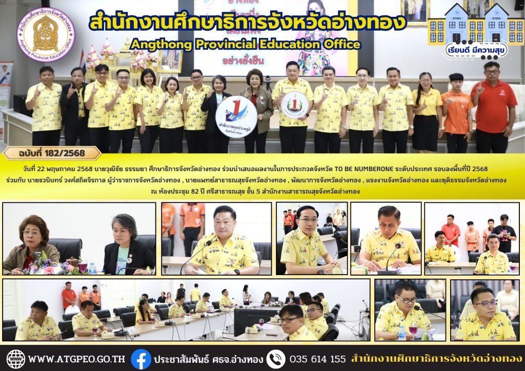 วันที่ 22 พฤษภาคม 2568 นายวุฒิชัย ธรรมยา ศึกษาธิการจังหวัดอ่างทอง ร่วมนำเสนอผลงานในการประกวดจังหวัด TO BE NUMBER ONE ระดับประเทศ รอบลงพื้นที่ปี 2568 ร่วมกับ นายชวนินทร์ วงศ์สถิตจิรกาล ผู้ว่าราชการจังหวัดอ่างทอง , นายแพทย์สาธารณสุขจังหวัดอ่างทอง ,พัฒนาการจังหวัดอ่างทอง , แรงงานจังหวัดอ่างทอง และยุติธรรมจังหวัดอ่างทอง ณ ห้องประชุม 82 ปี ศรีสาธารณสุข ชั้น 5 สำนักงานสาธารณสุขจังหวัดอ่างทอง