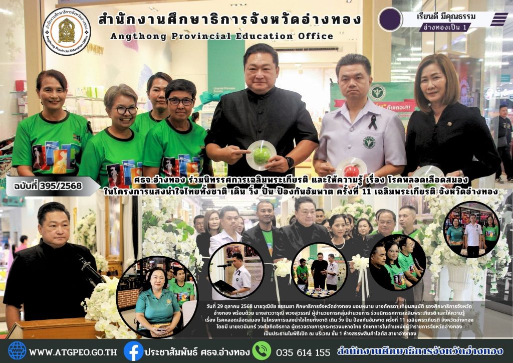 วันที่ 29 ตุลาคม 2568 นายวุฒิชัย ธรรมยา ศึกษาธิการจังหวัดอ่างทอง มอบหมาย นางภัครดา เทียนสมบัติ รองศึกษาธิการจังหวัดอ่างทอง พร้อมด้วย นางสาววารุณี พวงสุวรรณ์ ผู้อำนวยการกลุ่มอำนวยการ ร่วมนิทรรศการเฉลิมพระเกียรติ และให้ความรู้ เรื่อง โรคหลอดเลือดสมอง ในโครงการแสงนำใจไทยทั้งชาติ เดิน วิ่ง ปั่น ป้องกันอัมพาต ครั้งที่ 11 เฉลิมพระเกียรติ จังหวัดอ่างทอง โดยมี นายชวนินทร์ วงศ์สถิตจิรกาล ผู้ตรวจราชการกระทรวงมหาดไทย รักษาการในตำแหน่งผู้ว่าราชการจังหวัดอ่างทอง เป็นประธานในพิธีเปิด ณ บริเวณ ชั้น 1 ห้างสรรพสินค้าโลตัส สาขาอ่างทอง