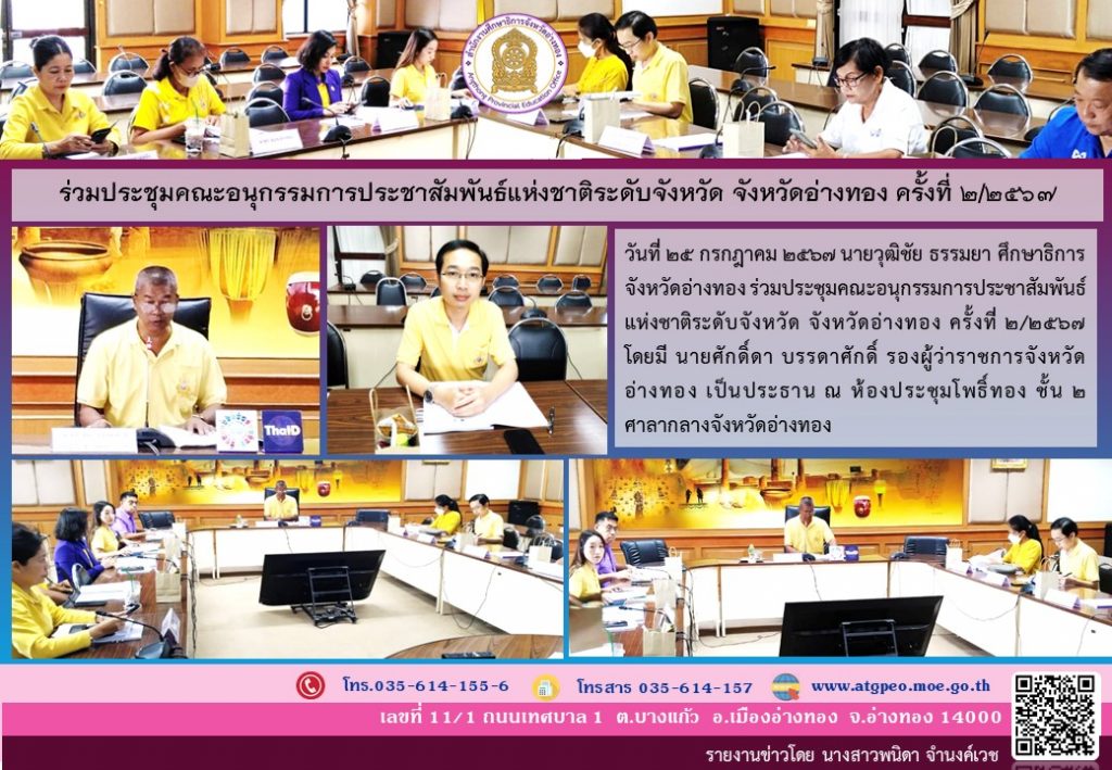 วันที่ 25 กรกฎาคม 2567 นายวุฒิชัย ธรรมยา ศึกษาธิการจังหวัดอ่างทอง ร่วมประชุมคณะอนุกรรมการประชาสัมพันธ์แห่งชาติระดับจังหวัด จังหวัดอ่างทอง ครั้งที่ 2/2567 โดยมี นายศักดิ์ดา บรรดาศักดิ์ รองผู้ว่าราชการจังหวัดอ่างทอง เป็นประธาน ณ ห้องประชุมโพธิ์ทอง ชั้น 2 ศาลากลางจังหวัดอ่างทอง