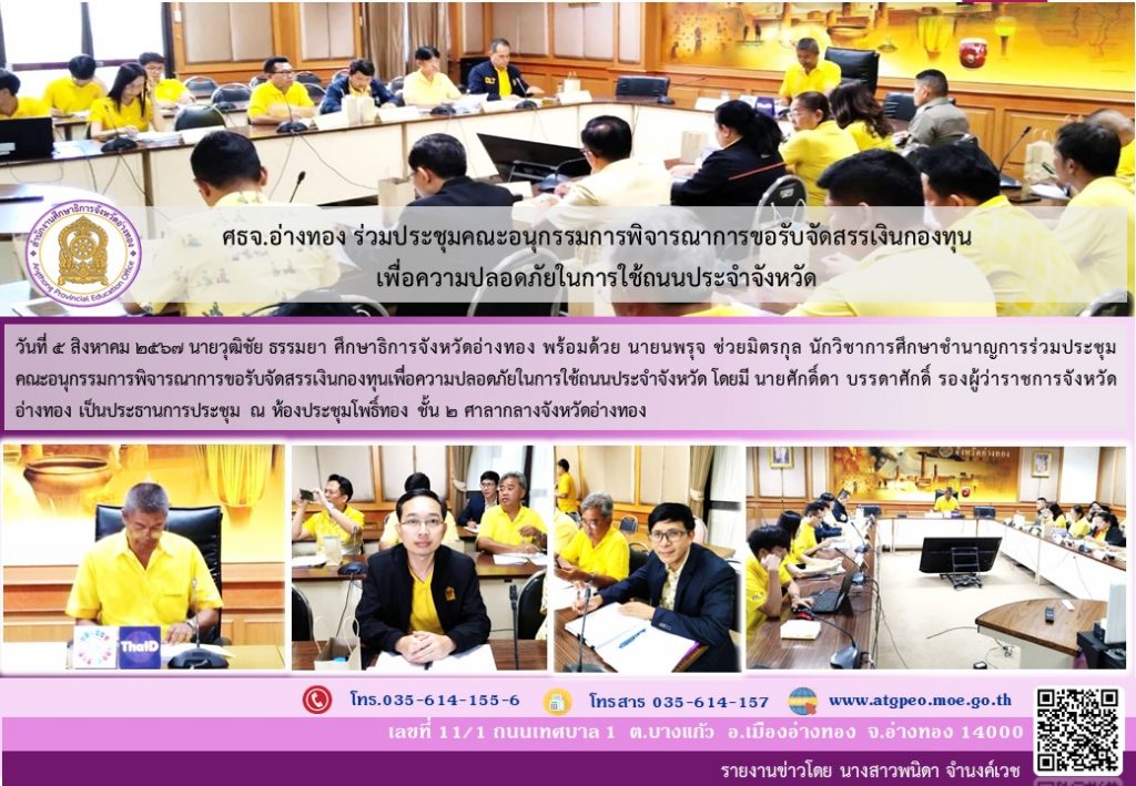 วันที่ 5 สิงหาคม 2567 นายวุฒิชัย ธรรมยา ศึกษาธิการจังหวัดอ่างทอง พร้อมด้วย นายนพรุจ ช่วยมิตรกุล นักวิชาการศึกษาชำนาญการร่วมประชุมคณะอนุกรรมการพิจารณาการขอรับจัดสรรเงินกองทุนเพื่อความปลอดภัยในการใช้ถนนประจำจังหวัด โดยมี นายศักดิ์ดา บรรดาศักดิ์ รองผู้ว่าราชการจังหวัดอ่างทอง เป็นประธานการประชุม ณ ห้องประชุมโพธิ์ทอง ชั้น 2 ศาลากลางจังหวัดอ่างทอง