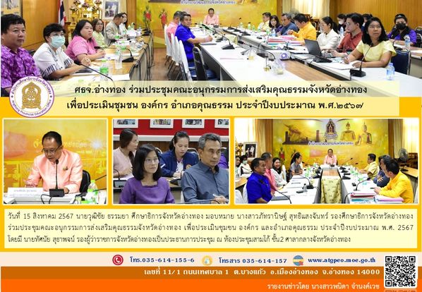 ศธจ.อ่างทอง ร่วมประชุมคณะอนุกรรมการส่งเสริมคุณธรรมจังหวัดอ่างทอง เพื่อประเมินชุมชน องค์กร และอำเภอคุณธรรม ประจำปีงบประมาณ พ.ศ. 2567