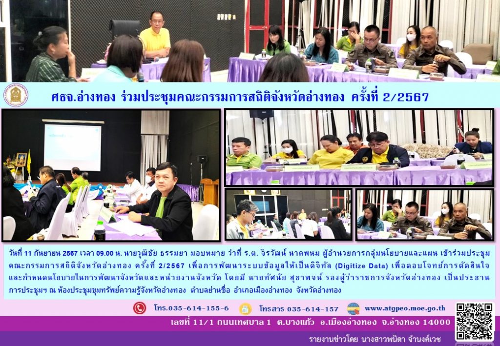 วันที่ 11 กันยายน 2567 เวลา 09.00 น. นายวุฒิชัย ธรรมยา มอบหมาย ว่าที่ ร.ต. จิรวัฒน์ นาคพนม ผู้อำนวยการกลุ่มนโยบายและแผน เข้าร่วมประชุมคณะกรรมการสถิติจังหวัดอ่างทอง ครั้งที่ 2/2567 เพื่อการพัฒนาระบบข้อมูลให้เป็นดิจิทัล (Digitize Data) เพื่อตอบโจทย์การตัดสินใจ และกำหนดนโยบายในการพัฒนาจังหวัดและหน่วยงานจังหวัด โดยมี นายทัศนัย สุธาพจน์ รองผู้ว่าราชการจังหวัดอ่างทอง เป็นประธาน การประชุมฯ ณ ห้องประชุมขุมทรัพย์ความรู้จังหวัดอ่างทอง ตำบลย่านซื่อ อำเภอเมืองอ่างทอง จังหวัดอ่างทอง