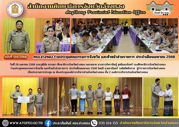 วันที่ 28 เมษายน 2568 นายวุฒิชัย ธรรมยา ศึกษาธิการจังหวัดอ่างทอง มอบหมาย นางสาวภัทรานิษฐ์ สุทธิแสงจันทร์ รองศึกษาธิการจังหวัดอ่างทอง ร่วมประชุมคณะกรมการจังหวัด และหัวหน้าส่วนราชการ ประจำเดือนเมษายน 2568 โดยมี นายชวนินทร์ วงศ์สถิตจิรกาล ผู้ว่าราชการจังหวัดอ่างทอง เป็นประธานการประชุม ณ ห้องประชุมองค์การบริหารส่วนจังหวัดอ่างทอง ชั้น 2 องค์การบริหารส่วนจังหวัดอ่างทอง
