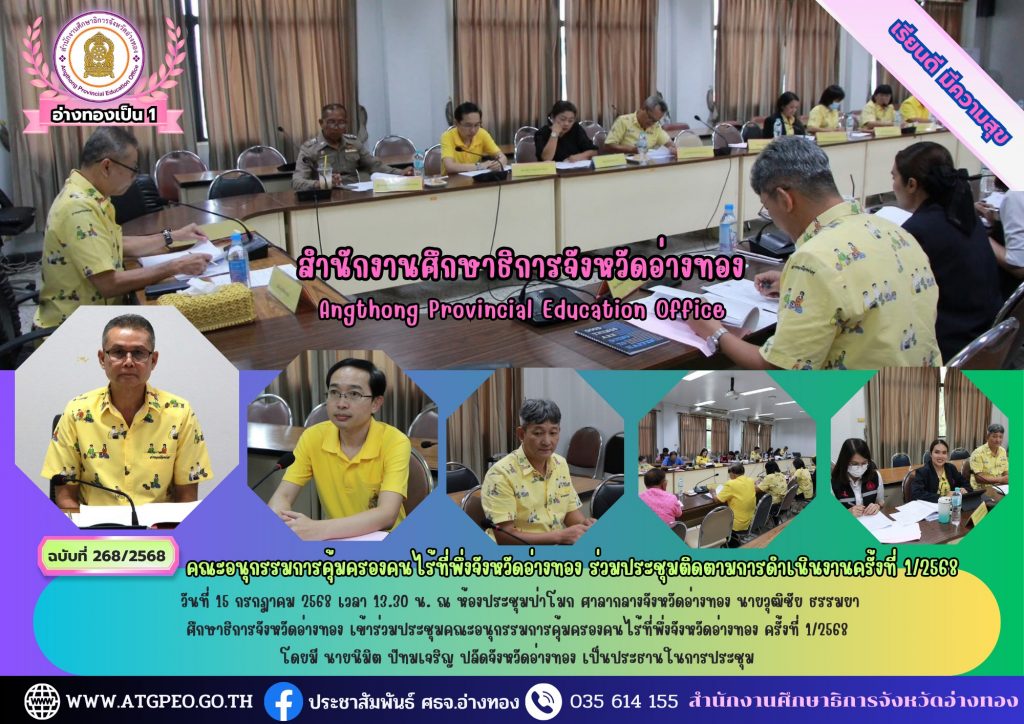 วันที่ 15 กรกฎาคม 2568 เวลา 13.30 น. ณ ห้องประชุมป่าโมก ศาลากลางจังหวัดอ่างทอง นายวุฒิชัย ธรรมยา ศึกษาธิการจังหวัดอ่างทอง เข้าร่วมประชุมคณะอนุกรรมการคุ้มครองคนไร้ที่พึ่งจังหวัดอ่างทอง ครั้งที่ 1/2568 โดยมี นายนิมิต ปัทมเจริญ ปลัดจังหวัดอ่างทอง เป็นประธานในการประชุม โดยที่ประชุมได้รับทราบรายงานผลการดำเนินงานตาม พ.ร.บ.การคุ้มครองคนไร้ที่พึ่ง พ.ศ. 2557, และรายงานการประเมินผลสัมฤทธิ์ของ พ.ร.บ.ฉบับดังกล่าว, ประกาศ หลักเกณฑ์และระเบียบที่เกี่ยวข้องกับการให้ความช่วยเหลือคนไร้ที่พึ่ง เช่น หลักเกณฑ์สนับสนุนด้านการเงิน, หลักเกณฑ์การรับคนไร้บ้านหรือคนเร่ร่อนเข้าสู่ ทะเบียนบ้านสำหรับคนไร้บ้านหรือคนเร่ร่อนที่เป็นคนไทย และแผนปฏิบัติการคุ้มครองคนไร้ที่พึ่งจังหวัดอ่างทองประจำปีงบประมาณ 2568 ในการนี้ คณะอนุกรรมการฯ ได้มีมติเห็นชอบการแต่งตั้งคณะทำงานสหวิชาชีพในการคุ้มครองคนไร้ที่พึ่งประจำจังหวัดอ่างทองด้วย