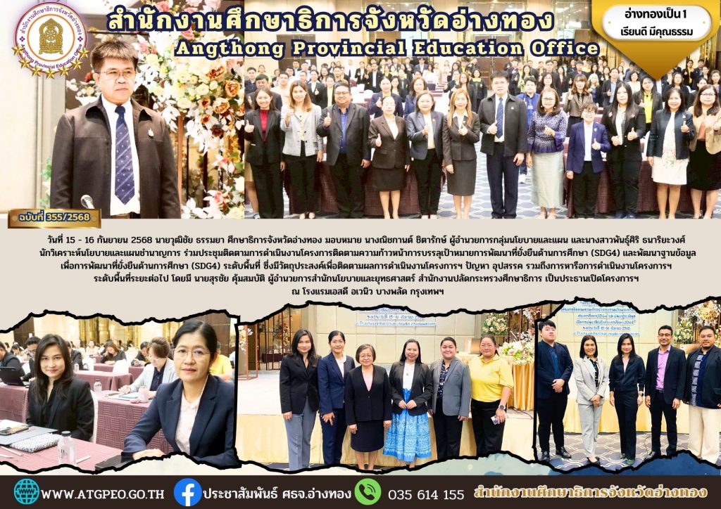 วันที่ 15 – 16 กันยายน 2568 นายวุฒิชัย ธรรมยา ศึกษาธิการจังหวัดอ่างทอง มอบหมาย นางณิชกานต์ ชิตารักษ์ ผู้อำนวยการกลุ่มนโยบายและแผน และนางสาวพันธุ์ศิริ ธนาริยะวงศ์ นักวิเคราะห์นโยบายและแผนชำนาญการ ร่วมประชุมติดตามการดำเนินงานโครงการติดตามความก้าวหน้าการบรรลุเป้าหมายการพัฒนาที่ยั่งยืนด้านการศึกษา (SDG4) และพัฒนาฐานข้อมูลเพื่อการพัฒนาที่ยั่งยืนด้านการศึกษา (SDG4) ระดับพื้นที่ ซึ่งมีวัตถุประสงค์เพื่อติดตามผลการดำเนินงานโครงการฯ ปัญหา อุปสรรค รวมถึงการหารือการดำเนินงานโครงการฯ ระดับพื้นที่ระยะต่อไป โดยมี นายสุรชัย คุ้มสมบัติ ผู้อำนวยการสำนักนโยบายและยุทธศาสตร์ สำนักงานปลัดกระทรวงศึกษาธิการ เป็นประธานเปิดโครงการฯ ณ โรงแรมเอสดี อเวนิว บางพลัด กรุงเทพฯ