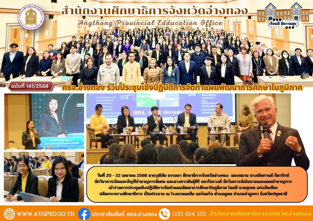 วันที่ 20 – 22 เมษายน 2568 นายวุฒิชัย ธรรมยา ศึกษาธิการจังหวัดอ่างทอง มอบหมาย นางณิชกานต์ ชิตารักษ์ นักวิชาการเงินและบัญชีชำนาญการพิเศษ และนางสาวพันธุ์ศิริ ธนาริยะวงศ์ นักวิเคราะห์นโยบายและแผนชำนาญการ เข้าร่วมการประชุมเชิงปฏิบัติการจัดทำแผนพัฒนาการศึกษาในภูมิภาค โดยมี นายสุเทพ แก่งสันเทียะ ปลัดกระทรวงศึกษาธิการ เป็นประธาน ณ โรงแรมเอเชีย แอร์พอร์ท ตำบลคูคต อำเภอลำลูกกา จังหวัดปทุมธานี