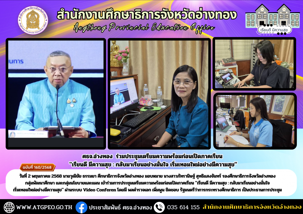 วันที่ 2 พฤษภาคม 2568 นายวุฒิชัย ธรรมยา ศึกษาธิการจังหวัดอ่างทอง มอบหมาย นางสาวภัทรานิษฐ์ สุทธิแสงจันทร์ รองศึกษาธิการจังหวัดอ่างทอง กลุ่มพัฒนาศึกษา และกลุ่มนโยบายและแผน เข้าร่วมการประชุมเตรียมความพร้อมก่อนเปิดภาคเรียน “เรียนดี มีความสุข : กลับมาเรียนอย่างมั่นใจ เริ่มเทอมใหม่อย่างมีความสุข” ผ่านระบบ Video Conferen โดยมี พลตำรวจเอก เพิ่มพูน ชิดชอบ รัฐมนตรีว่าการกระทรวงศึกษาธิการ เป็นประธานการประชุม