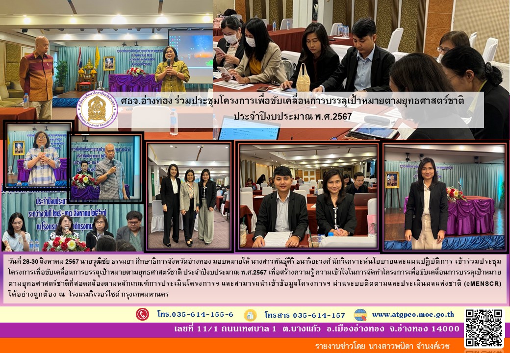 วันที่ 28-30 สิงหาคม 2567 นายวุฒิชัย ธรรมยา ศึกษาธิการจังหวัดอ่างทอง มอบหมายให้ นางสาวพันธุ์ศิริ ธนาริยะวงศ์ นักวิเคราะห์นโยบายและแผนปฏิบัติการ เข้าร่วมประชุมโครงการเพื่อขับเคลื่อนการบรรลุเป้าหมายตามยุทธศาสตร์ชาติ ประจำปีงบประมาณ พ.ศ.2567 เพื่อสร้างความรู้ ความเข้าใจในการจัดทำโครงการเพื่อขับเคลื่อนการบรรลุเป้าหมายตามยุทธศาสตร์ชาติที่สอดคล้องตามหลักเกณฑ์การประเมินโครงการฯ และสามารถนำเข้าข้อมูลโครงการฯ ผ่านระบบติดตามและประเมินผลแห่งชาติ (eMENSCR) ได้อย่างถูกต้อง ณ โรงแรมริเวอร์ไซด์ กรุงเทพมหานคร