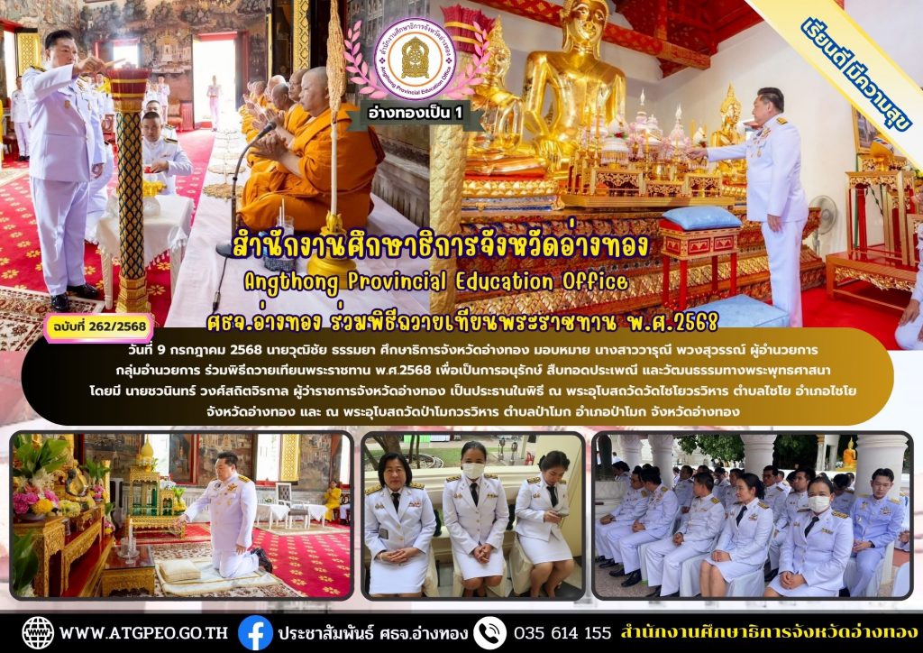 วันที่ 9 กรกฎาคม 2568 นายวุฒิชัย ธรรมยา ศึกษาธิการจังหวัดอ่างทอง มอบหมาย นางสาววารุณี พวงสุวรรณ์ ผู้อำนวยการ กลุ่มอำนวยการ ร่วมพิธีถวายเทียนพระราชทาน พ.ศ.2568 เพื่อเป็นการอนุรักษ์ สืบทอดประเพณี และวัฒนธรรมทางพระพุทธศาสนา โดยมี นายชวนินทร์ วงศ์สถิตจิรกาล ผู้ว่าราชการจังหวัดอ่างทอง เป็นประธานในพิธี ณ พระอุโบสถวัดวัดไชโยวรวิหาร ตำบลไชโย อำเภอไชโย จังหวัดอ่างทอง และ ณ พระอุโบสถวัดป่าโมกวรวิหาร ตำบลป่าโมก อำเภอป่าโมก จังหวัดอ่างทอ