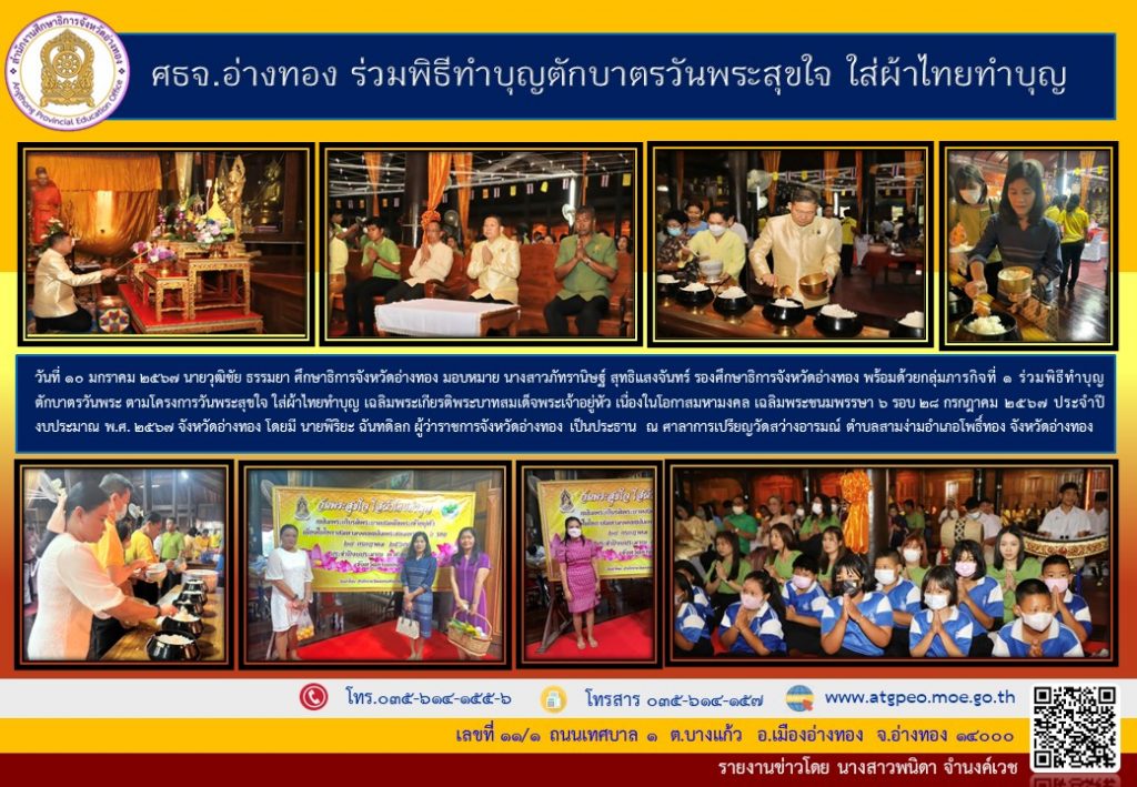 วันที่ 10 มกราคม 2567 นายวุฒิชัย ธรรมยา ศึกษาธิการจังหวัดอ่างทอง มอบหมาย นางสาวภัทรานิษฐ์ สุทธิแสงจันทร์ รองศึกษาธิการจังหวัดอ่างทอง พร้อมด้วยกลุ่มภารกิจที่ 1 ร่วมพิธีทำบุญ ตักบาตรวันพระ ตามโครงการวันพระสุขใจ ใส่ผ้าไทยทำบุญ เฉลิมพระเกียรติพระบาทสมเด็จพระเจ้าอยู่หัว เนื่องในโอกาสมหามงคล เฉลิมพระชนมพรรษา 6 รอบ 28 กรกฎาคม 2567 ประจำปีงบประมาณ พ.ศ. 2567 จังหวัดอ่างทอง โดยมี นายพิริยะ ฉันทดิลก ผู้ว่าราชการจังหวัดอ่างทอง เป็นประธาน  ณ ศาลาการเปรียญวัดสว่างอารมณ์ ตำบลสามง่ามอำเภอโพธิ์ทอง จังหวัดอ่างทอง