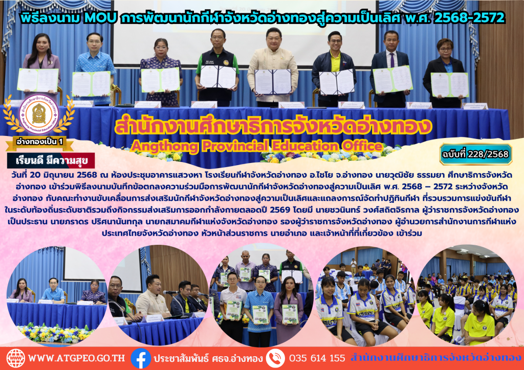 วันที่ 20 มิถุนายน 2568 ณ ห้องประชุมอาคารแสวงหา โรงเรียนกีฬาจังหวัดอ่างทอง อ.ไชโย จ.อ่างทอง นายวุฒิชัย ธรรมยา ศึกษาธิการจังหวัดอ่างทอง เข้าร่วมพิธีลงนามบันทึกข้อตกลงความร่วมมือการพัฒนานักกีฬาจังหวัดอ่างทองสู่ความเป็นเลิศ พ.ศ. 2568 – 2572 ระหว่างจังหวัดอ่างทอง กับคณะทำงานขับเคลื่อนการส่งเสริมนักกีฬาจังหวัดอ่างทองสู่ความเป็นเลิศและแถลงการณ์จัดทำปฏิทินกีฬา ที่รวบรวมการแข่งขันกีฬา ในระดับท้องถิ่นระดับชาติรวมถึงกิจกรรมส่งเสริมการออกกำลังกายตลอดปี 2569 โดยมี นายชวนินทร์ วงศ์สถิตจิรกาล ผู้ว่าราชการจังหวัดอ่างทอง เป็นประธาน นายภราดร ปริศนานันทกุล นายกสมาคมกีฬาแห่งจังหวัดอ่างทอง รองผู้ว่าราชการจังหวัดอ่างทอง ผู้อำนวยการสำนักงานการกีฬาแห่งประเทศไทยจังหวัดอ่างทอง หัวหน้าส่วนราชการ นายอำเภอ และเจ้าหน้าที่ที่เกี่ยวข้อง เข้าร่วม