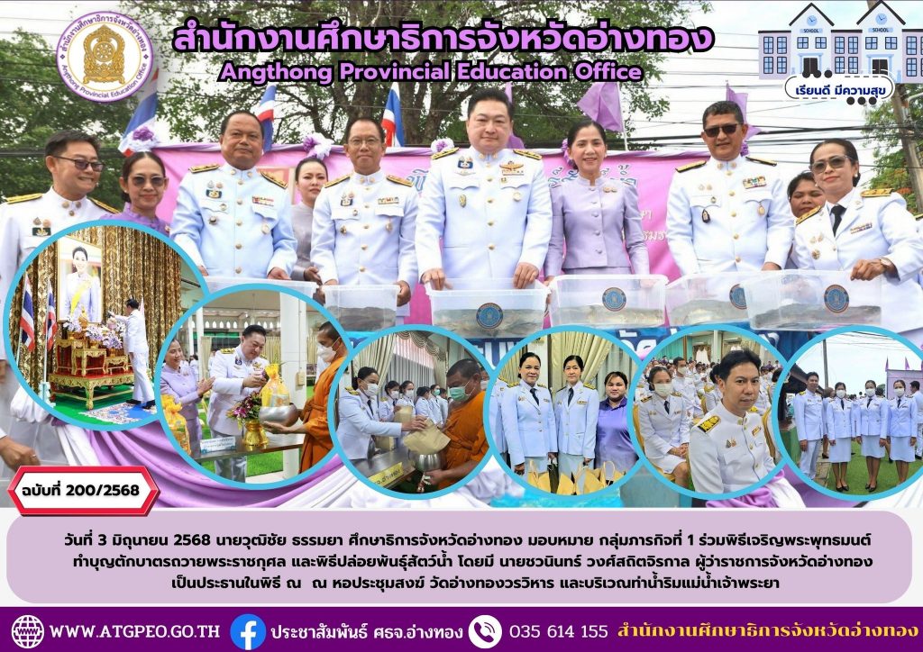 วันที่ 3 มิถุนายน 2568 นายวุฒิชัย ธรรมยา ศึกษาธิการจังหวัดอ่างทอง มอบหมาย กลุ่มภารกิจที่ 1 ร่วมพิธีเจริญพระพุทธมนต์ ทำบุญตักบาตรถวายพระราชกุศล และพิธีปล่อยพันธุ์สัตว์น้ำ โดยมี นายชวนินทร์ วงศ์สถิตจิรกาล ผู้ว่าราชการจังหวัดอ่างทอง เป็นประธานในพิธี ณ ณ หอประชุมสงฆ์ วัดอ่างทองวรวิหาร และบริเวณท่าน้ำริมแม่น้ำเจ้าพระยา