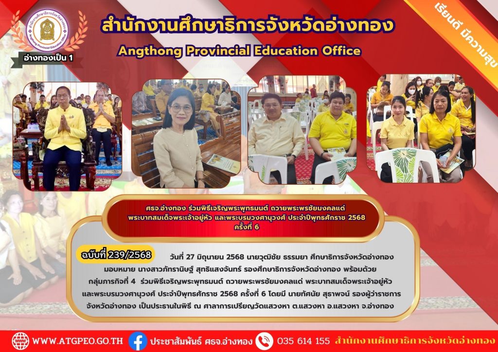 วันที่ 27 มิถุนายน 2568 นายวุฒิชัย ธรรมยา ศึกษาธิการจังหวัดอ่างทอง มอบหมาย นางสาวภัทรานิษฐ์ สุทธิแสงจันทร์ รองศึกษาธิการจังหวัดอ่างทอง พร้อมด้วย กลุ่มภารกิจที่ 4 ร่วมพิธีเจริญพระพุทธมนต์ ถวายพระพรชัยมงคลแด่ พระบาทสมเด็จพระเจ้าอยู่หัว และพระบรมวงศานุวงศ์ ประจำปีพุทธศักราช 2568 ครั้งที่ 6 โดยมี นายทัศนัย สุธาพจน์รองผู้ว่าราชการจังหวัดอ่างทอง เป็นประธานในพิธี ณ ศาลาการเปรียญวัดแสวงหา ต.แสวงหา อ.แสวงหา