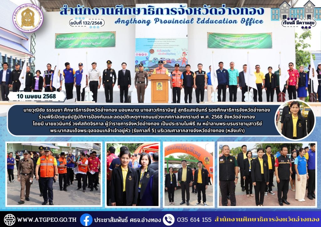 วันที่ 10 เมษายน 2568 นายวุฒิชัย ธรรมยา ศึกษาธิการจังหวัดอ่างทอง มอบหมาย นางสาวภัทรานิษฐ์ สุทธิแสงจันทร์ รองศึกษาธิการจังหวัดอ่างทอง ร่วมพิธีเปิดศูนย์ปฏิบัติการป้องกันและลดอุบัติเหตุทางถนนช่วงเทศกาลสงกรานต์ พ.ศ. 2568 จังหวัดอ่างทอง โดยมี นายชวนินทร์ วงศ์สถิตจิรกาล ผู้ว่าราชการจังหวัดอ่างทอง เป็นประธานในพิธี ณ หน้าลานพระบรมราชานุสาวรีย์ พระบาทสมเด็จพระจุลจอมเกล้าเจ้าอยู่หัว (รัชกาลที่ 5) บริเวณศาลากลางจังหวัดอ่างทอง (หลังเก่า)