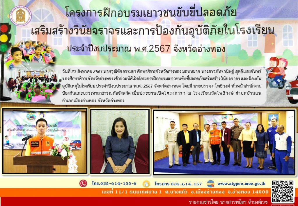 วันที่ 23 สิงหาคม 2567 นายวุฒิชัย ธรรมยา ศึกษาธิการจังหวัดอ่างทอง มอบหมาย นางสาวภัทรานิษฐ์ สุทธิแสงจันทร์ รองศึกษาธิการจังหวัดอ่างทอง เข้าร่วมพิธีเปิดโครงการฝึกอบรมเยาวชนขับขี่ปลอดภัยเสริมสร้างวินัยจราจรและป้องกันอุบัติเหตุในโรงเรียน ประจำปีงบประมาณ พ.ศ. 2567 จังหวัดอ่างทอง โดยมี นายบรรจง โพธิวงค์ หัวหน้าสำนักงานป้องกันและบรรเทาสาธารณภัยจังหวัด เป็นประธานเปิดโครงการฯ ณ โรงเรียนวัดโพธิวงษ์ ตำบลบ้านแห อำเภอเมืองอ่างทอง จังหวัดอ่างทอง