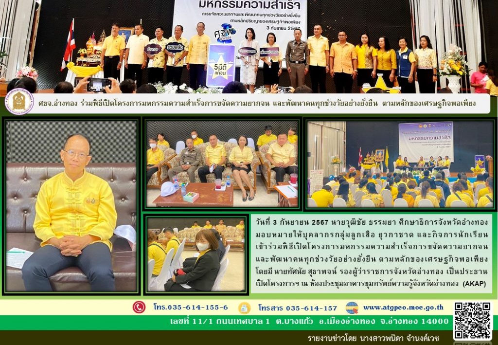 วันที่ 3 กันยายน 2567 นายวุฒิชัย ธรรมยา ศึกษาธิการจังหวัดอ่างทอง มอบหมายให้บุคลากรกลุ่มลูกเสือ ยุวกาชาด และกิจการนักเรียน เข้าร่วมพิธีเปิดโครงการมหกรรมความสำเร็จการขจัดความยากจน และพัฒนาคนทุกช่วงวัยอย่างยั่งยืน ตามหลักของเศรษฐกิจพอเพียง โดยมี นายทัศนัย สุธาพจน์ รองผู้ว่าราชการจังหวัดอ่างทอง เป็นประธาน เปิดโครงการฯ ณ ห้องประชุมอาคารขุมทรัพย์ความรู้จังหวัดอ่างทอง (AKAP)