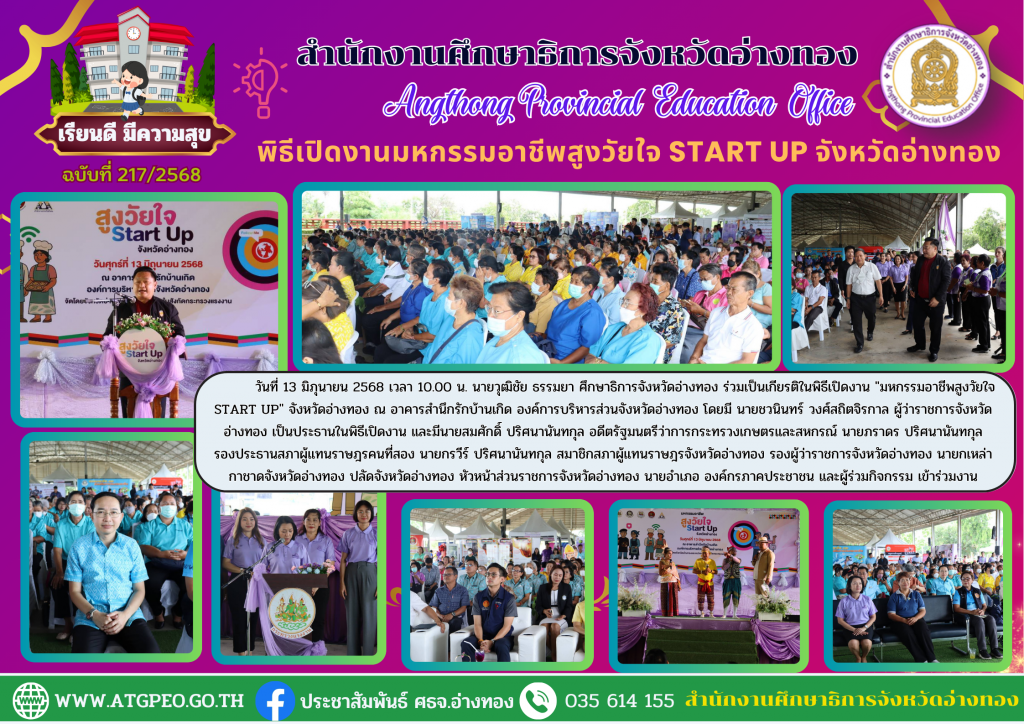 วันที่ 13 มิภุนายน 2568 นายวุฒิชัย ธรรมยา ศึกษาธิการจังหวัดอ่างทอง ร่วมเป็นเกียรติในพิธีเปิดงาน “มหกรรมอาชีพสูงวัยใจ START UP” จังหวัดอ่างทอง ณ อาคารสำนึกรักบ้านเกิด องค์การบริหารส่วนจังหวัดอ่างทอง โดยมี นายชวนินทร์ วงศ์สถิตจิรกาล ผู้ว่าราชการจังหวัดอ่างทอง เป็นประธานในพิธีเปิดงาน และมีนายสมศักดิ์ ปริศนานันทกุล อดีตรัฐมนตรีว่าการกระทรวงเกษตรและสหกรณ์ นายภราดร ปริศนานันทกุล รองประธานสภาผู้แทนราษฎรคนที่สอง นายกรวีร์ ปริศนานันทกุล สมาชิกสภาผู้แทนราษฎรจังหวัดอ่างทอง รองผู้ว่าราชการจังหวัดอ่างทอง นายกเหล่ากาชาดจังหวัดอ่างทอง ปลัดจังหวัดอ่างทอง หัวหน้าส่วนราชการจังหวัดอ่างทอง นายอำเภอ องค์กรภาคประชาชน และผู้ร่วมกิจกรรม เข้าร่วมงาน