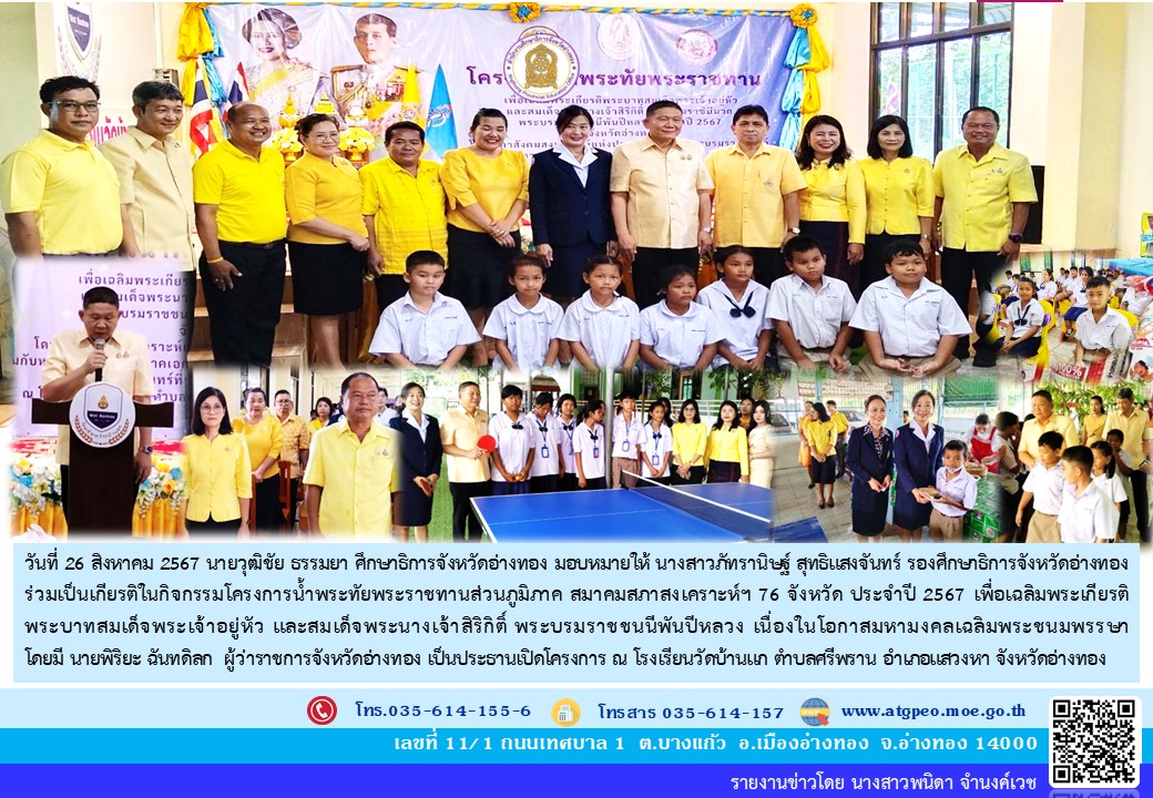 วันที่ 26 สิงหาคม 2567 นายวุฒิชัย ธรรมยา ศึกษาธิการจังหวัดอ่างทอง มอบหมายให้ นางสาวภัทรานิษฐ์ สุทธิแสงจันทร์ รองศึกษาธิการจังหวัดอ่างทอง ร่วมเป็นเกียรติในกิจกรรมโครงการน้ำพระทัยพระราชทานส่วนภูมิภาค สมาคมสภาสงเคราะห์ฯ 76 จังหวัด ประจำปี 2567 เพื่อเฉลิมพระเกียรติพระบาทสมเด็จพระเจ้าอยู่หัว และสมเด็จพระนางเจ้าสิริกิติ์ พระบรมราชชนนีพันปีหลวง เนื่องในโอกาสมหามงคลเฉลิมพระชนมพรรษา โดยมี นาพิริยะ ฉันทดิลก ผู้ว่าราชการจังหวัดอ่างทอง เป็นประธานเปิดโครงการ ณ โรงเรียนวัดบ้านแก