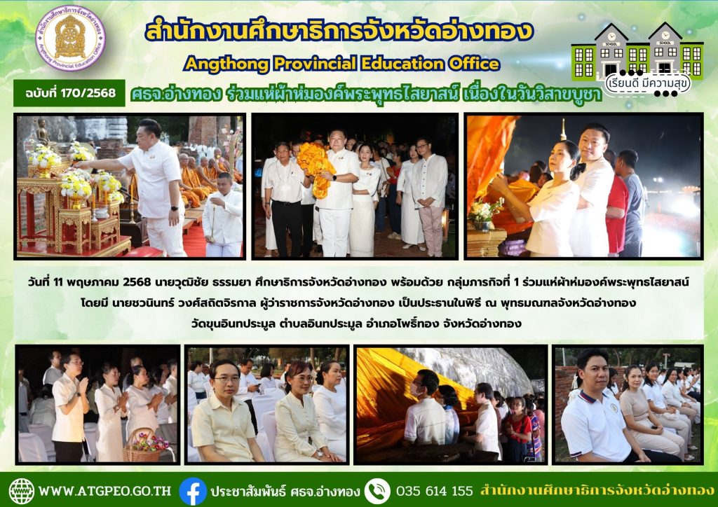 วันที่ 11 พฤษภาคม 2568 นายวุฒิชัย ธรรมยา ศึกษาธิการจังหวัดอ่างทอง พร้อมด้วย กลุ่มภารกิจที่ 1 ร่วมแห่ผ้าห่มองค์พระพุทธไสยาสน์ โดยมี นายชวนินทร์ วงศ์สถิตจิรกาล ผู้ว่าราชการจังหวัดอ่างทอง เป็นประธานในพิธี ณ พุทธมณฑลจังหวัดอ่างทอง วัดขุนอินทประมูล ตำบลอินทประมูล อำเภอโพธิ์ทอง จังหวัดอ่างทอง