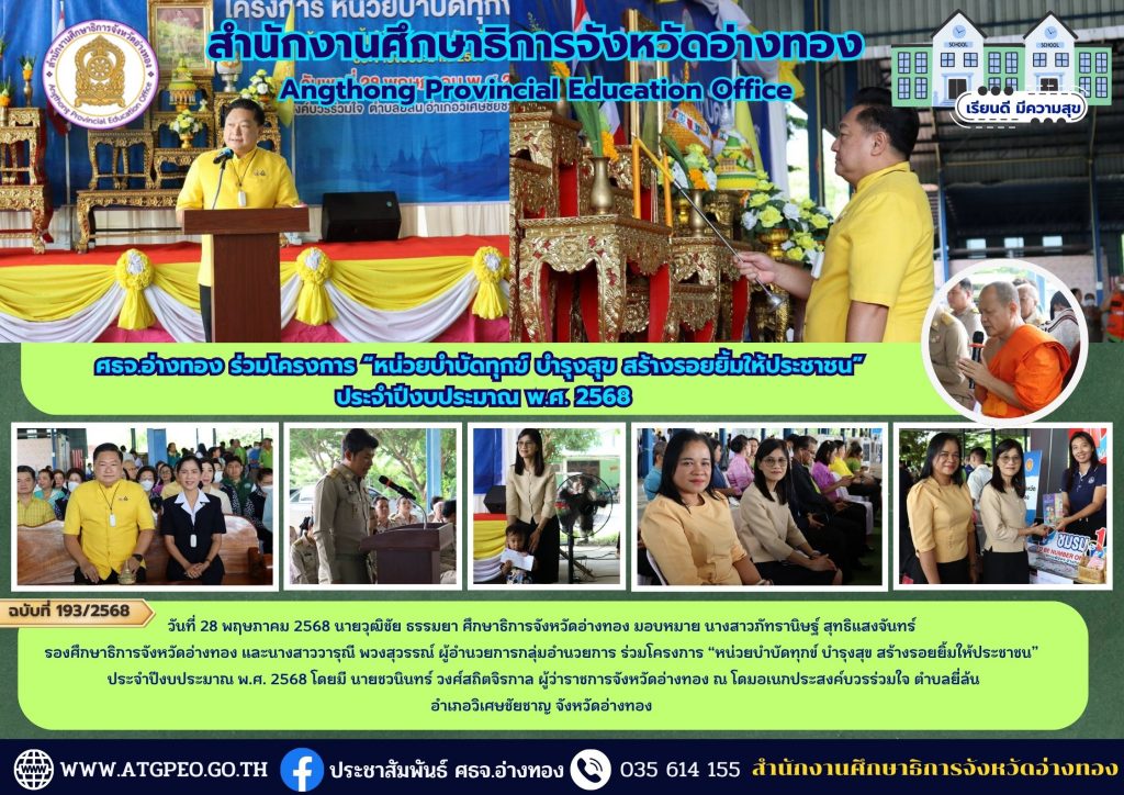 วันที่ 28 พฤษภาคม 2568 นายวุฒิชัย ธรรมยา ศึกษาธิการจังหวัดอ่างทอง มอบหมาย นางสาวภัทรานิษฐ์ สุทธิแสงจันทร์รองศึกษาธิการจังหวัดอ่างทอง และนางสาววารุณี พวงสุวรรณ์ ผู้อำนวยการกลุ่มอำนวยการ ร่วมโครงการ “หน่วยบำบัดทุกข์ บำรุงสุข สร้างรอยยิ้มให้ประชาชน”ประจำปีงบประมาณ พ.ศ. 2568 โดยมี นายชวนินทร์ วงศ์สถิตจิรกาล ผู้ว่าราชการจังหวัดอ่างทอง ณ โดมอเนกประสงค์บวรร่วมใจ ตำบลยี่ล้น อำเภอวิเศษชัยชาญ จังหวัดอ่างทอง
