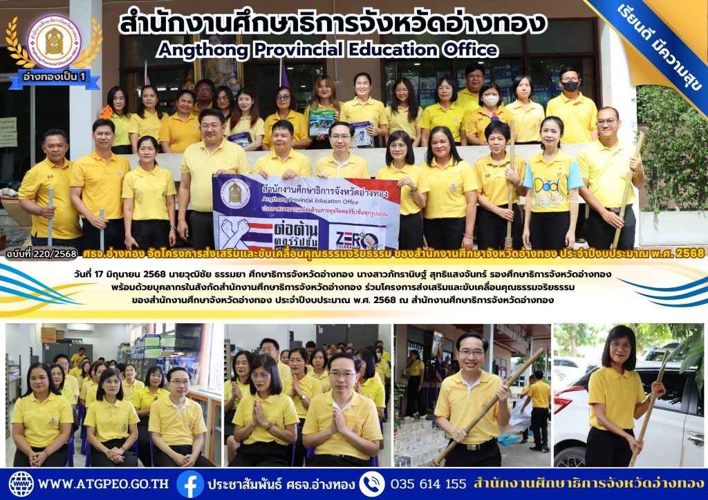 วันที่ 17 มิถุนายน 2568 นายวุฒิชัย ธรรมยา ศึกษาธิการจังหวัดอ่างทอง นางสาวภัทรานิษฐ์ สุทธิแสงจันทร์ รองศึกษาธิการจังหวัดอ่างทอง พร้อมด้วยบุคลากรในสังกัดสำนักงานศึกษาธิการจังหวัดอ่างทอง ร่วมโครงการส่งเสริมและขับเคลื่อนคุณธรรมจริยธรรม ของสำนักงานศึกษาจังหวัดอ่างทอง ประจำปีงบประมาณ พ.ศ. 2568 ณ สำนักงานศึกษาธิการจังหวัดอ่างทอง