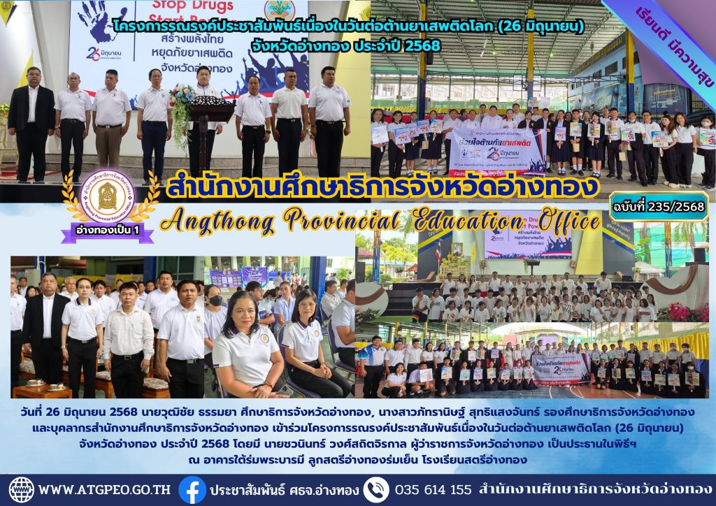 วันที่ 26 มิถุนายน 2568 นายวุฒิชัย ธรรมยา ศึกษาธิการจังหวัดอ่างทอง, นางสาวภัทรานิษฐ์ สุทธิแสงจันทร์ รองศึกษาธิการจังหวัดอ่างทอง และบุคลากรสำนักงานศึกษาธิการจังหวัดอ่างทอง เข้าร่วมโครงการรณรงค์ประชาสัมพันธ์เนื่องในวันต่อต้านยาเสพติดโลก (26 มิถุนายน) จังหวัดอ่างทอง ประจำปี 2568 โดยมี นายชวนินทร์ วงศ์สถิตจิรกาล ผู้ว่าราชการจังหวัดอ่างทอง เป็นประธานในพิธีฯ ณ อาคารใต้ร่มพระบารมี ลูกสตรีอ่างทองร่มเย็น โรงเรียนสตรีอ่างทอง
