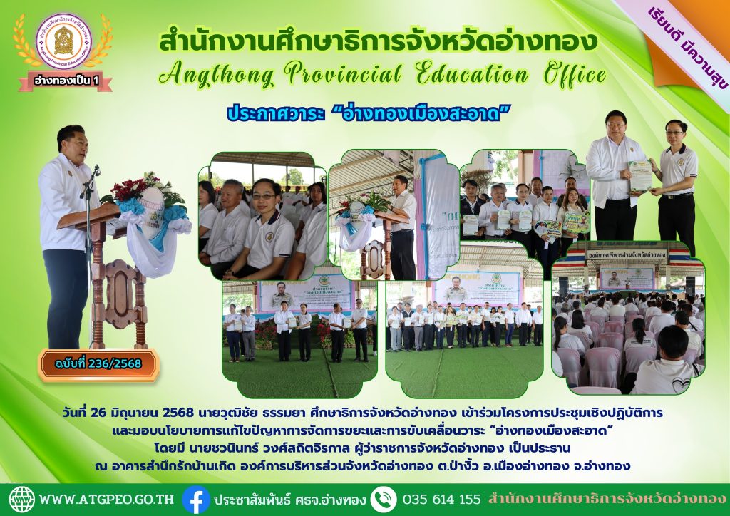 วันที่ 26 มิถุนายน 2568 นายวุฒิชัย ธรรมยา ศึกษาธิการจังหวัดอ่างทอง เข้าร่วมโครงการประชุมเชิงปฏิบัติการ และมอบนโยบายการแก้ไขปัญหาการจัดการขยะและการขับเคลื่อนวาระ “อ่างทองเมืองสะอาด” โดยมี นายชวนินทร์ วงศ์สถิตจิรกาล ผู้ว่าราชการจังหวัดอ่างทอง เป็นประธาน ณ อาคารสำนึกรักบ้านเกิด องค์การบริหารส่วนจังหวัดอ่างทอง ต.ป่างิ้ว อ.เมืองอ่างทอง จ.อ่างทอง