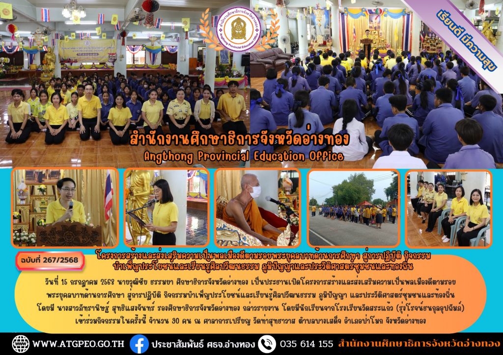 วันที่ 15 กรกฎาคม 2568 นายวุฒิชัย ธรรมยา ศึกษาธิการจังหวัดอ่างทอง เป็นประธานเปิดโครงการสร้างและส่งเสริมความเป็นพลเมืองดีตามรอยพระยุคลบาทด้านการศึกษา สู่การปฏิบัติ กิจกรรมบำเพ็ญประโยชน์และเรียนรู้ศิลปวัฒนธรรม ภูมิปัญญาและประวัติศาสตร์ชุมชนและท้องถิ่น โดยมี นางสาวภัทรานิษฐ์ สุทธิแสงจันทร์ รองศึกษาธิการจังหวัดอ่างทอง กล่าวรายงาน โดยมีนักเรียนจากโรงเรียนวัดสระแก้ว (รุ่งโรจน์ธนกุลอุปถัมภ์) เข้าร่วมกิจกรรมในครั้งนี้ จำนวน 90 คน ณ ศาลาการเปรียญ วัดท่าสุทธาวาส ตำบลบางเสด็จ อำเภอป่าโมก จังหวัดอ่างทอง