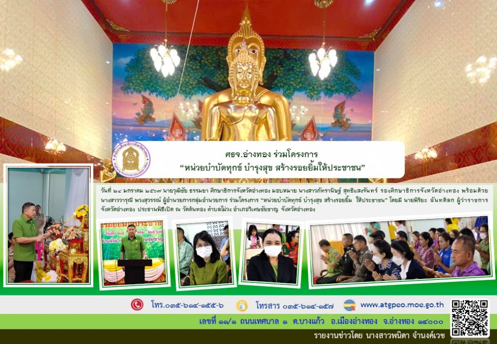 วันที่ 24 มกราคม 2567 นายวุฒิชัย ธรรมยา ศึกษาธิการจังหวัดอ่างทอง มอบหมาย นางสาวภัทรานิษฐ์ สุทธิแสงจันทร์ รองศึกษาธิการจังหวัดอ่างทอง พร้อมด้วย นางสาววารุณี พวงสุวรรณ์ ผู้อำนวยการกลุ่มอำนวยการ ร่วมโครงการ “หน่วยบำบัดทุกข์ บำรุงสุข สร้างรอยยิ้ม ให้ประชาชน” โดยมี นายพิริยะ ฉันทดิลก ผู้ว่าราชการจังหวัดอ่างทอง ประธานพิธีเปิด ณ วัดต้นทอง ตำบลไผ่วง อำเภอวิเศษชัยชาญ จังหวัดอ่างทอง